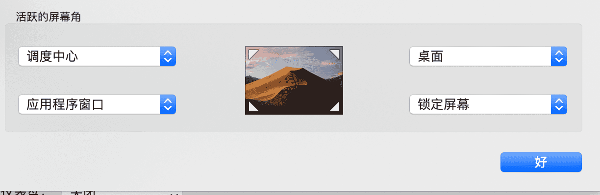 触发角可以让我们迅速让电脑休眠而不用手动合上屏幕, 打开 系统偏好设置 -> 屏幕保护程序 -> 触发角 当人离开座位时,需要将电脑锁屏以保证代码安全,建议按照下图方式设置触发角